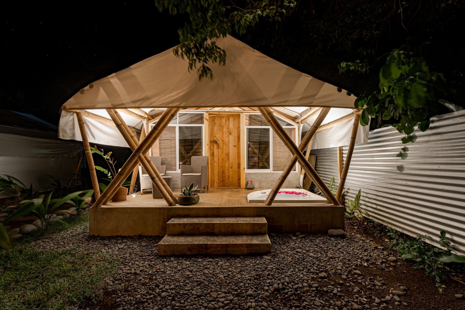 Hermoso Glamping con vista al mar, rodeado de naturaleza, cuenta con 1 cama matrimonial, baño externo y Jacuzzi a la intemperie.